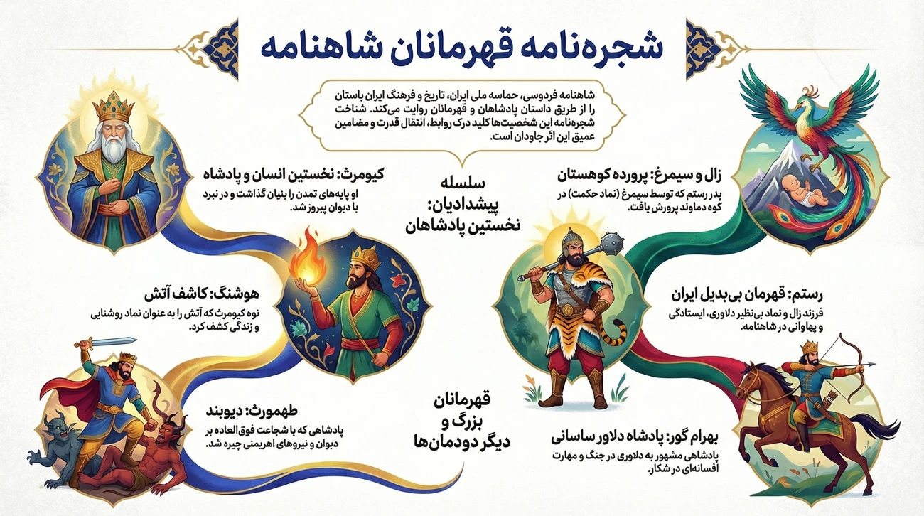 شناخت شجره نامه شخصیت های شاهنامه، یکی از آثار ارزنده زبان فارسی، اهمیت زیادی در فهم عمیق تر این اثر ادبی و تاریخی دارد. این شجره نامه نه تنها روابط خانوادگی و نسب شخصیت ها را مشخص می کند، بلکه به درک بهتر وقایع تاریخی و اجتماعی آن دوران نیز کمک می کند.